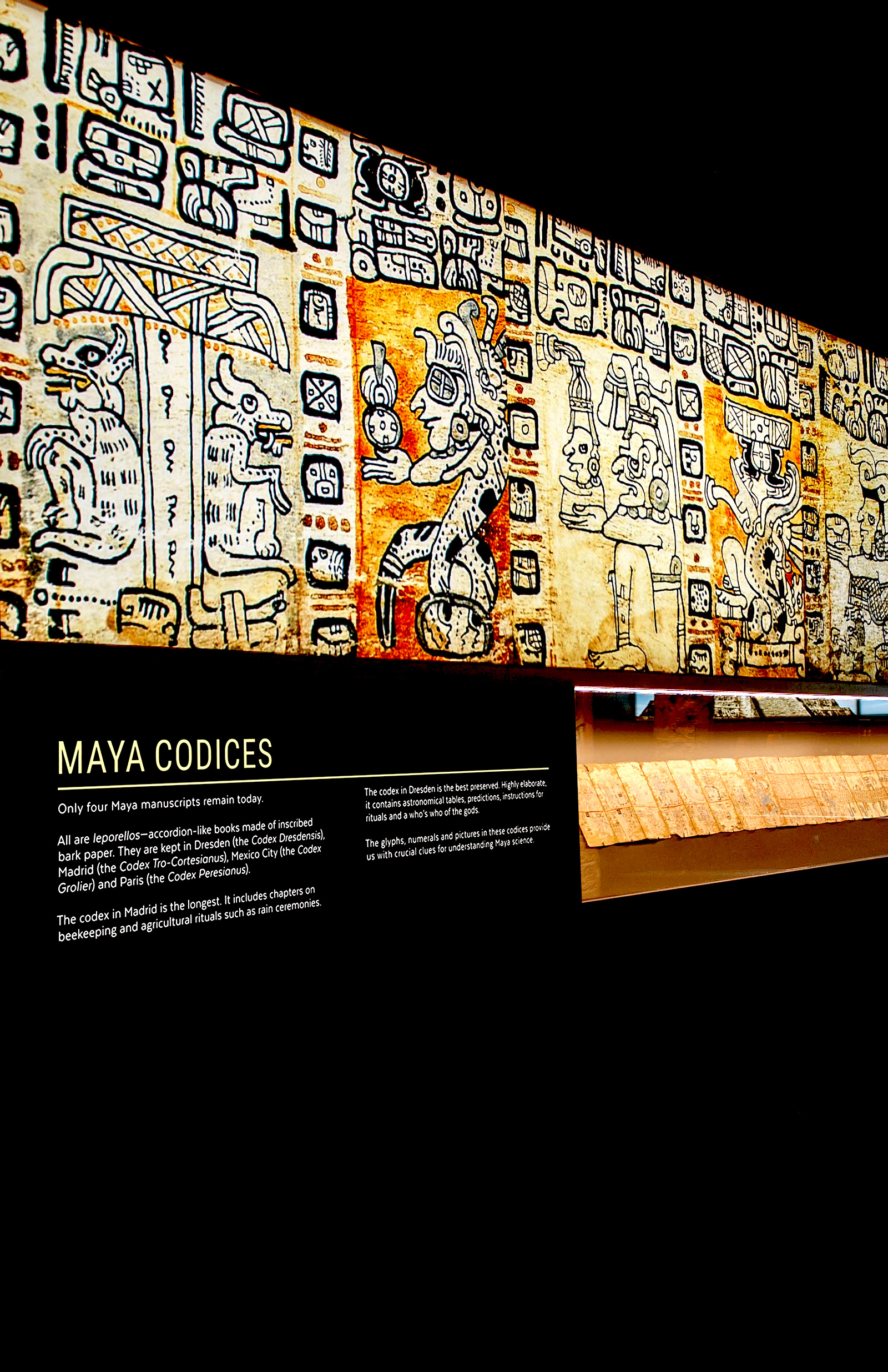 The new exhibition graphics [on backlit fabric displays, backlit foils, glass foils, Plexi and Forex panels] provide clear visual reference for the visitors throughout the various thematic areas, effectively communicate the key messages and give a holistic image of Maya culture.
